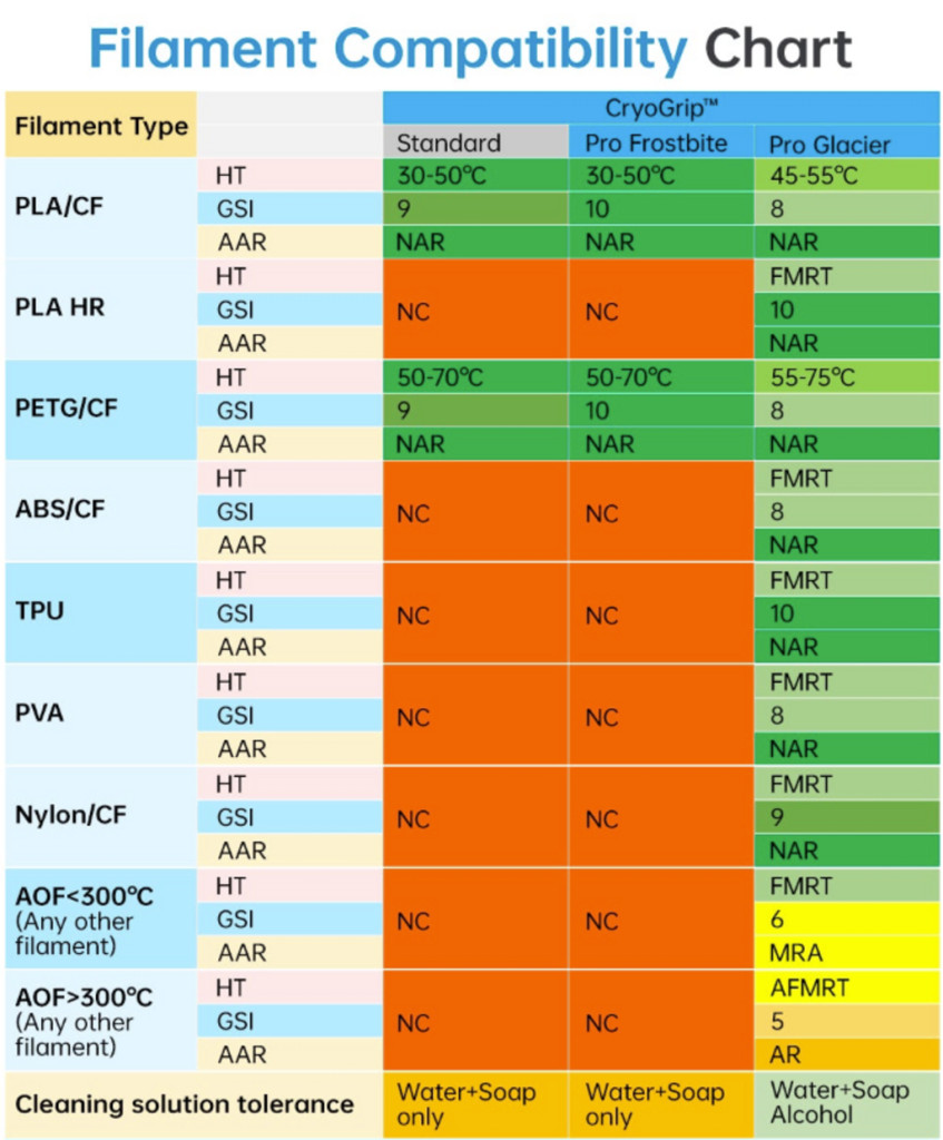 A CryoGrip Pro Glacier egy tartós, nagy teljesítményű tárgyasztal, amely erős tapadást biztosít alacsony hőmérsékleten is, miközben megkönnyíti a nyomatok eltávolítását. Kompatibilis számos filament típussal, beleértve a PLA-t, PETG-t. A hőálló, öntisztuló felület csökkenti a vetemedést, és megbízható nyomtatást tesz lehetővé magas asztalhőmérséklet nélkül.