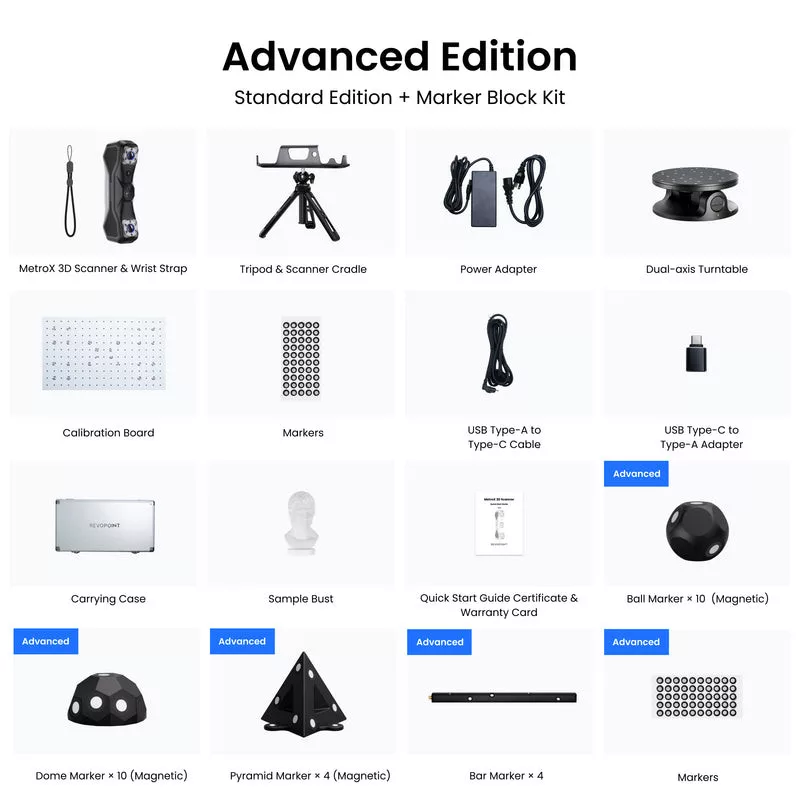 A MetroX Advanced Edition (Haladó csomag) egyedi Marker Block Kittel érkezik, amely nem elérhető a Standard csomagban. Ez a készlet jelentősen javítja a szkennelés hatékonyságát, mivel 10 kupolamarkert, 4 piramisjelölőt, 10 golyós jelölőt, 4 sávos jelölőt és 500 jelölőpontot tartalmaz. Ezek az újrafelhasználható markerek ideálisak lézeres szkenneléshez vagy sima, jellegtelen objektumok teljes mező módban történő szkenneléséhez, így értékes időt takaríthat meg minden projektnél.