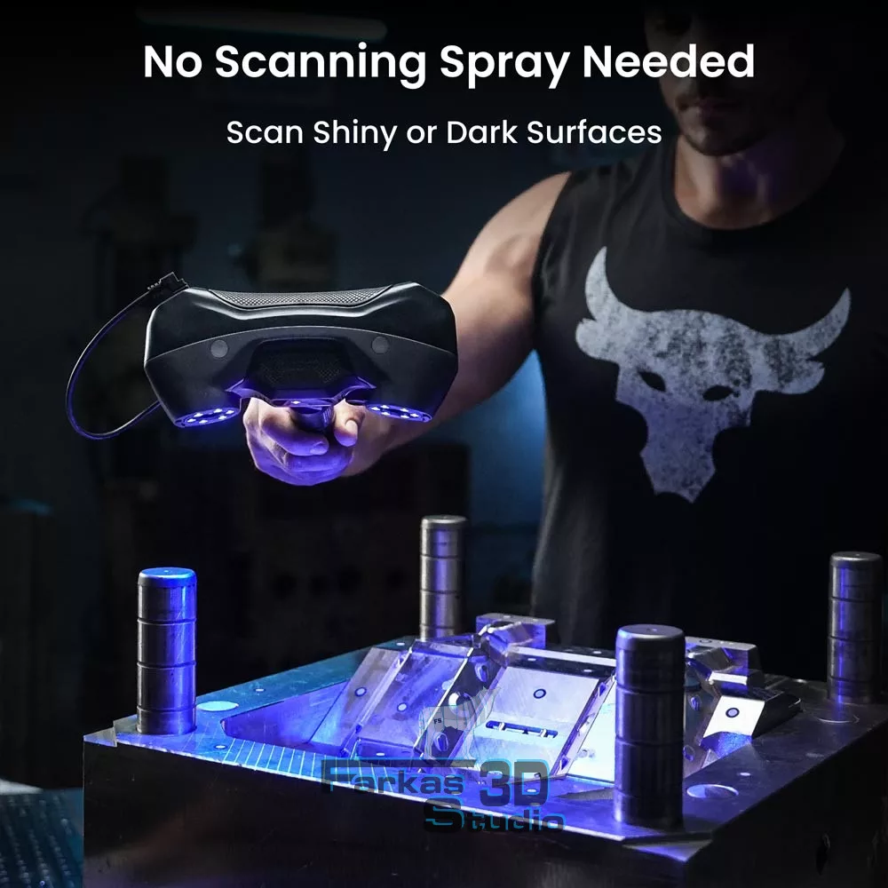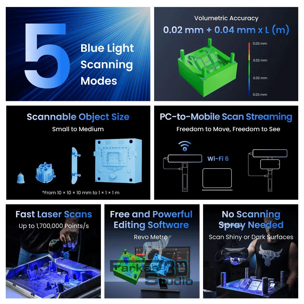A Revopoint MetroY Pro egy fejlett, kék lézeres és strukturált fényű 3D szkenner, amelyet kifejezetten finom részletek, komplex geometriák és nehezen szkennelhető felületek pontos rögzítésére terveztek. A készülék akár 0,01 mm-es precizitással és 0,02 mm-es pontossággal dolgozik, miközben másodpercenként akár 1,7 millió pontot is rögzít.